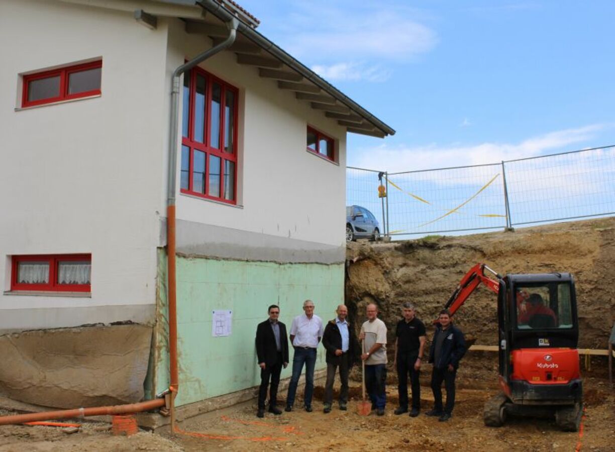 Versammelten sich in der Baugrube zum symbolischen Spatenstich für den Anbau an das Gerätehaus der Feuerwehr Ruppertskirchen: von links: KBM Helmut Schaitl, Architekt Franz Eras, Bürgermeister Alfons Sittinger, Kommandant Anton Stadlbauer, Vorstand Alois Gerwallner und 2. Kommandant Reinhard Straubinger (Foto: Machtl)