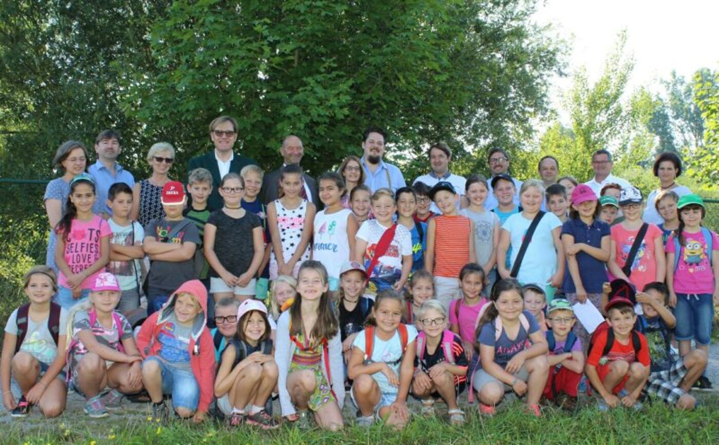 Die Arnstorfer Au, ein nahezu 20000 Quadratmeter großes Natur- und Naherholungsgebiet mitten im Ort, ist nicht nur bei Freizeitsportlern und Spaziergängern angekommen, sondern auch bei den Grundschülern. Vor allem die Klasse 3c mit ihrer Lehrerin Alexandra Seiler ist voll begeistert. Beim Wandertag im Herbst 2016 waren die Mädchen und Buben erstmals in der Au unterwegs, dann hat sie das Thema in Heimat- und Sachkunde das ganze Jahr über begleitet. Aus der intensiven Beschäftigung mit Pflanzen und Tieren im Unterricht und vor Ort, aus Referaten und der Art, wie sie selbst das grüne Refugium erleben durften, ist sogar ein ganz besonderes Projekt entstanden: Ein Naturführer – von Kindern für Kinder – 52 bunte Seiten stark und spannend von der ersten bis zur letzten Zeile. Alexandra Seiler hat die Arbeiten gesammelt und in den Pfingstferien digitalisiert, Rainer Gratz von Gratz Design hat die Gesamtgestaltung übernommen. Dank großzügiger Unterstützung von Sponsoren ging das Werk in Druck und kann nun kostenlos an Interessierte verteilt werden. Als Begleiter durch das Büchlein haben sich die Kinder den Kiebitz „Kiebi“ ausgesucht, einen Vogel, der früher ein typischer Wiesenbrüter in der Arnstorfer Au war. Neben der kindgerechten Beschreibung von Tieren und Pflanzen in der Luft, im Wasser und auf der Erde – ebenfalls im Unterricht der Klasse 3c entstanden – gibt der Kiebi in gelben Infokästchen Wissens- oder Aktionstipps, die mithelfen, ein Stück Heimat kennen zu lernen, gelungene Zeichnungen der Kinder, jede Menge Bilder und Kiebis Rätselfragen zur Arnstorfer Au auf den letzten Seiten machen den Führer zu einem spannenden und Anschauens werten Werk. Klar, dass man zur öffentlichen Vorstellung des Büchleins in die Au geladen hatte. Da gab Bürgermeister Alfons Sittinger den jungen Buchautoren ebenso die Ehre wie Bezirksrat Dr. Thomas Pröckl, eine Reihe von Sponsoren und Gudrun Grabmeier vom Landschaftspflegeverband. „Ich habe schon beim Workshop der Gemeinde Feuer gefangen und mit vom ersten Augenblick an in die Au und in die Idee verliebt, dass dort Jung und Alt zusammen finden können“, bekannte Grundschulrektorin Margit Jaeschke bei ihrem Willkommen. “Das habt ihr sehr gut gemacht, ich bin davon begeistert“, drückte Bürgermeister Sittinger den Drittklässlern Lob und Anerkennung aus und richtete einen herzlichen Dank an die Sponsoren. „Ich mag die Bäume, die wunderschöne grüne Au“ versicherten die Kinder der 3c auch musikalisch ihre Liebe zur Natur. Um die nachfolgenden Grundschüler mit dem Thema Au vertraut zu machen und sie dafür zu begeistern, nahmen sie die Kinder der zweite Klasse von Lehrerin Ingrid Wahland mit auf Erkundungstour zu den Schmetterlingen, Bienen, Blumen und Insekten auf der Wiese und zu Tieren und Pflanzen im Wasser, am Ufer und im Wald. Mit dem Gedicht von James Krüss „Das Lied vom Wald“ bewiesen Mädchen der 2. Klasse, dass sie sich mit dem Thema, das sie ab September stärker beschäftigen wird, schon vertraut gemacht haben.