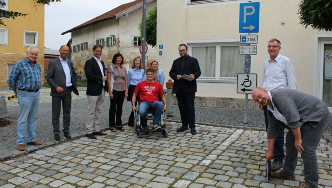Dieser viel zu schmale Behindertenparkplatz am Unteren Markt wird von 2,50 Meter auf 3,60 Meter verbreitert; Ingenieur Heinz Kaltenhauser und Bauhofleiter Hans Eder (von rechts) zeigten den Teilnehmer an der Begehung „Arnstorf barrierefrei“ die neue Breite auf. (Foto: Machtl)