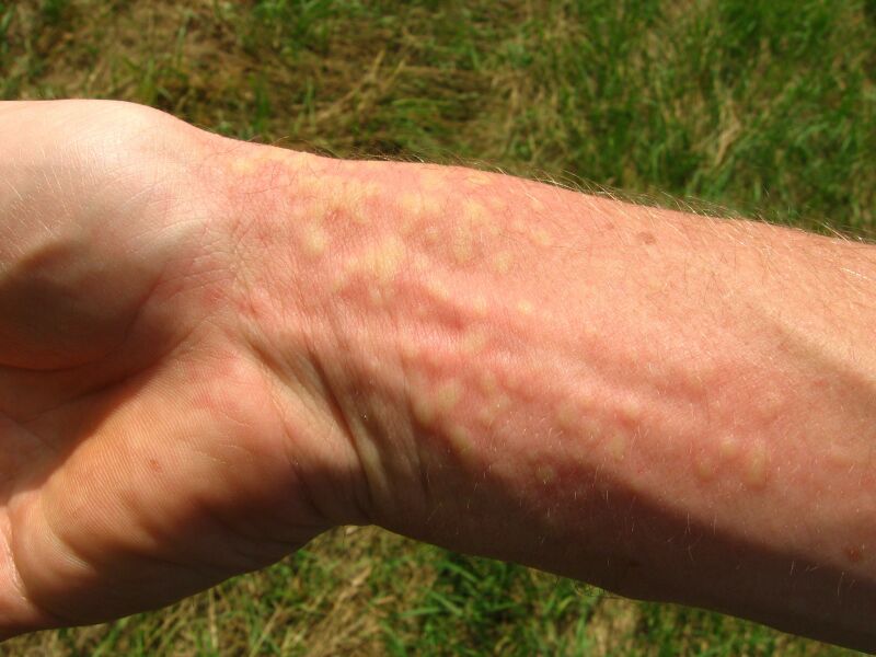 „Das möglicherweise noch in den Brennhaaren enthaltene Eiweiß Thaumetopoein kann beim Menschen zu einer Raupendermatitis führen“, erklärt SVLFG-Mitarbeiterin Dr. Alexandra Riethmüller. Sie ist im Bereich Prävention unter anderem zuständig für biologische Gefährdungen, zu denen auch die Brennhaare des Eichenprozessionsspinners gehören. „Typische Hautreaktionen sind Juckreiz, Ausschlag, Quaddeln und Bläschen. Außerdem können Entzündungen der Schleimhäute – wie an der Augenbindehaut und Rachenschleimhaut – sowie Atemnot auftreten. Wiederholter Kontakt verschlimmert die Symptome. In schweren Fällen kann die Reaktion in einen lebensbedrohenden anaphylaktischen Schock münden“, ergänzt Dr. Riethmüller.